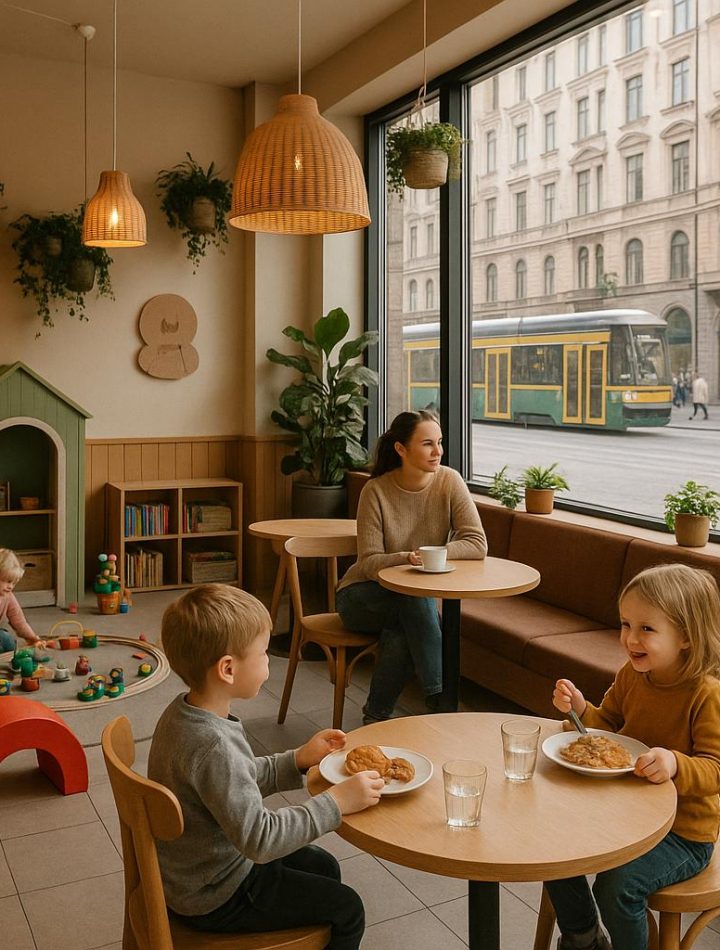 Sisustus on kodikas ja salliva ilman liikaa kirkkaita muovileluja. Paikan vahvuus on siinä, ettei kenenkään tarvitse pyytää anteeksi lasten äänekkyyttä – ilo ja vilkas uteliaisuus kuuluvat asiaan.